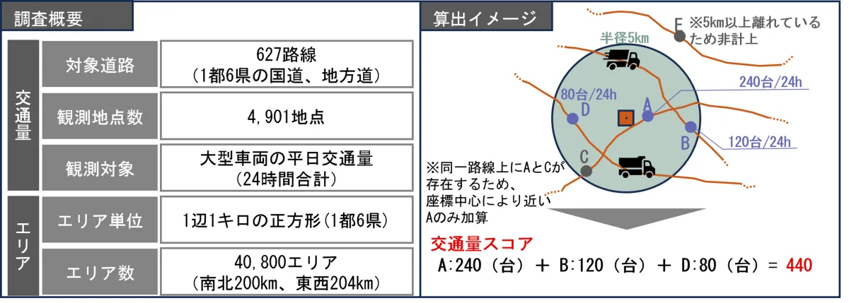 この研究の目的は、大型車両の交通量が物流施設の需要に与える影響を評価し、地域ごとの需給状況を把握することにあります。特に、交通量データは物流ニーズの把握において重要な指標となります。