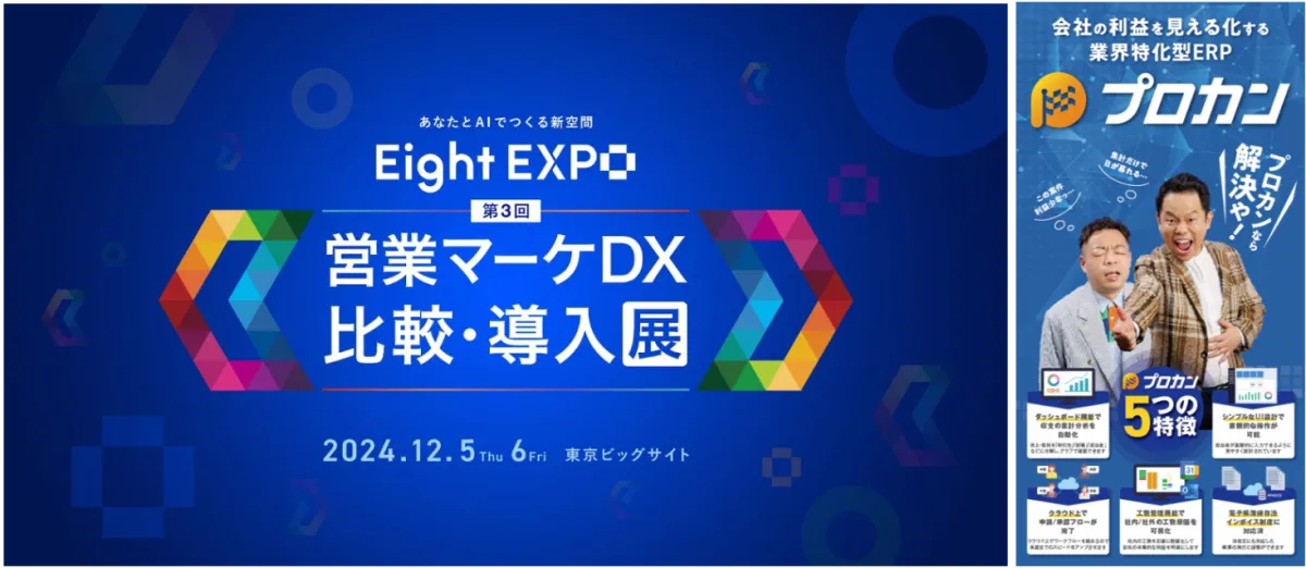 株式会社PROCANが運営する業界特化型ERPプロジェクト収支管理システム「プロカン」が、2024年12月5日(木)と6日(金)の2日間、東京ビッグサイトで行われる「Eight EXPO 第3回 営業マーケDX 比較・導入展」に出展することが決定しました。