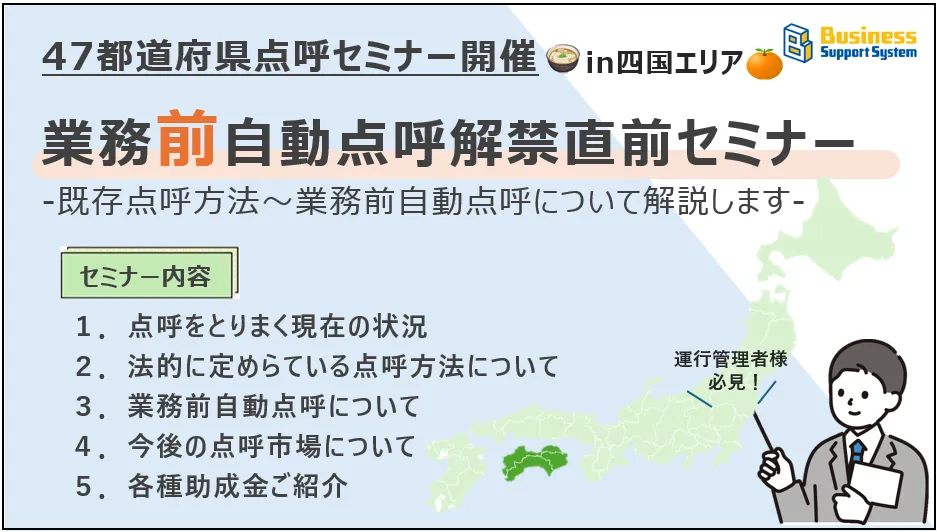 運送業務を行う皆様へ、重要なお知らせです。業務前自動点呼に関する大変有益なセミナーが四国エリアで開催されます。これは、昨年のセミナーの成功を受けて実施されるものであり、参加者は法的に認められた点呼方法や、各社に合った運用法を学ぶことができます。
