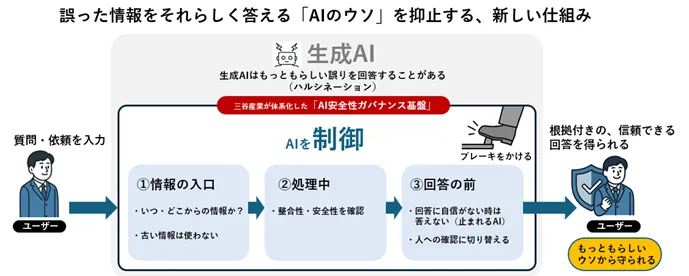 このような状況の中、三谷産業が開発した「AI信頼性ガバナンス基盤」は、AIが提供する情報の「入口」「工程」「出口」を段階的に管理し、情報の信頼性を確保する仕組みを構築しています。