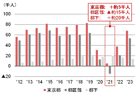 一方で、コロナ禍の影響で、10歳未満および60歳以上の層以外が都区部から転出超過に転じ、転出数は依然として高水準を維持しています。2021年には、約5000人の転入超過数が、前年に比べて大幅に減少しました。特に都区部は15000人の転出超過を記録しています。