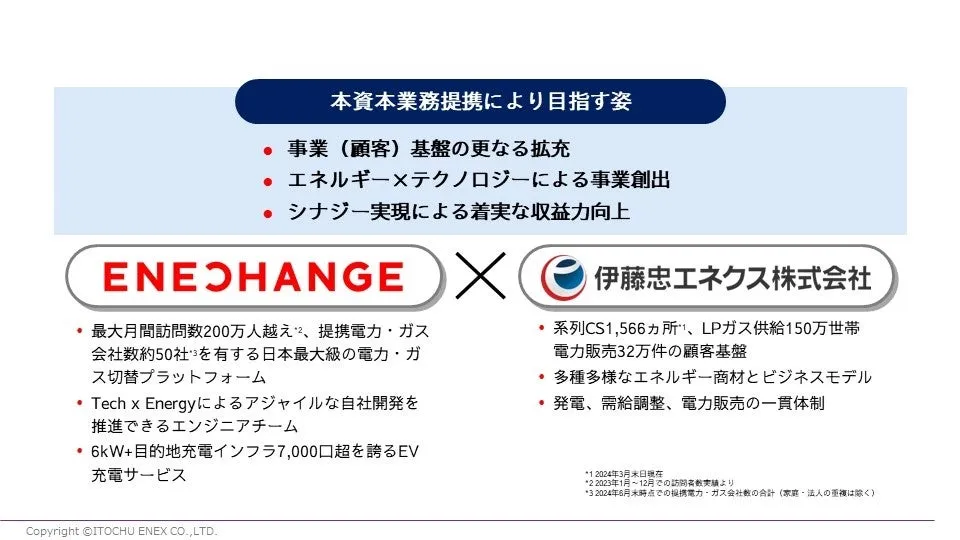 伊藤忠エネクス株式会社がENECHANGE株式会社との資本業務提携を発表しました。これにより、エネルギー業界に新たな動きが期待されます。具体的な内容は、ENECHANGE社の第三者割当増資を引き受け、同社の筆頭株主となることです。これにより、ENECHANGE社の持つ最新のエネルギーサービスを最大限に活用できる体制が整います。