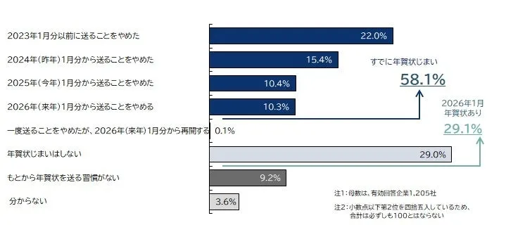 近年、年賀状を送付する企業の姿勢に顕著な変化が起きています。株式会社帝国データバンクが実施したアンケート調査によると、全体の58.1%の企業がすでに年賀状の送付をやめており、2026年分の年賀状を送る企業はついに30%未満となる見込みです。この「年賀状じまい」は、送付コストや手間の削減を目的とした流れの一環として、多くの企業に広がりを見せています。