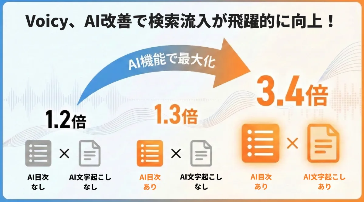 音声プラットフォームのVoicyは、2025年9月に新たなAI機能として「AI目次表示」と「AI文字起こし」を導入しました。この機能の導入により、音声コンテンツへの検索流入において驚くべき変化が見られました。調査によると、特定の条件下で検索流入数が最大で3.4倍に増加する結果が出ています。この成果は、新たな機能の効果を明確に示しており、今後の音声コンテンツの可能性を広げています。