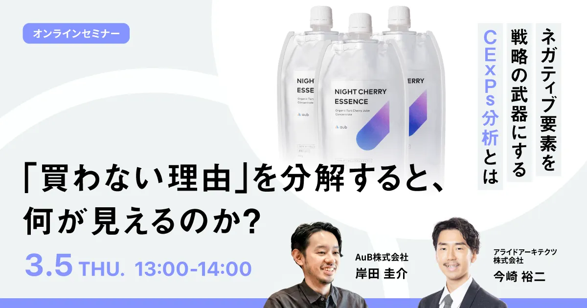 さらに、ゲストスピーカーとしてAuB株式会社の岸田氏を迎え、彼が担当する睡眠サポート商品「NIGHT CHERRY ESSENCE」の新規市場参入時にどのようにCExPs分析を実践し、仮説をデータに基づいて検証したのか、その貴重な経験を共有します。