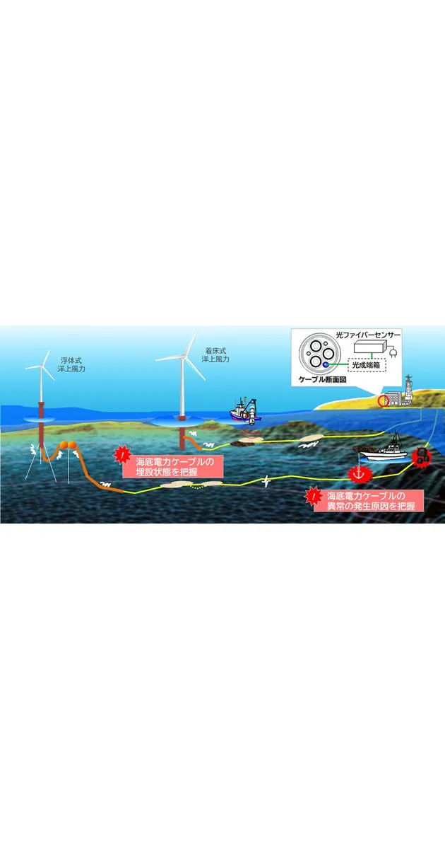 OKIは、海底電力ケーブル周辺の環境をモニタリングするために、光ファイバー技術を駆使しています。温度や振動、音響といったデータをリアルタイムで測定し、問題が起きた場所を迅速に把握することができるのです。これにより、従来のメンテナンスコストを大幅に削減し、異常発生時の早期対応につながります。