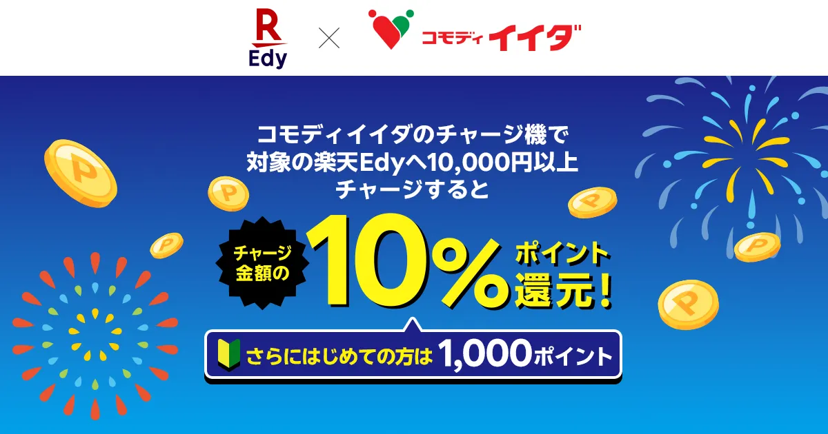 「コモディイイダ」の店舗に設置された充電機を利用して、もしくは「コモディイイダ Edy-楽天ポイントカード」へ10,000円以上チャージすることで、チャージ金額の10%相当の楽天ポイントを還元します。このキャンペーンは、初めてのチャージをされる方にも嬉しい特典があり、10,000円以上チャージを行うとさらに1,000ポイントが進呈されるのです。