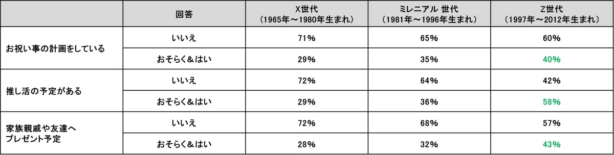 購買動向に関して、特にZ世代において「推し活」や「お祝い」、「プレゼントを贈る」ことの重要性が増していることが明らかになりました。調査によると、58%のZ世代が「推し活をする可能性が高い」と述べています。さらに、食品、スナック、ソフトドリンク、アルコール飲料、家庭用品などはGW期間中に購入される可能性が高いカテゴリーであるとされています。