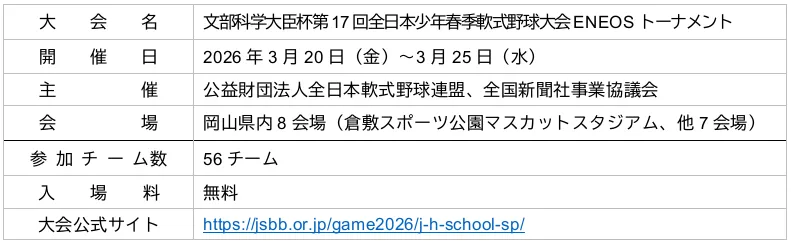 ENEOS株式会社の協賛のもと、「文部科学大臣杯 第17回全日本少年春季軟式野球大会 ENEOSトーナメント」が、2023年3月20日から25日まで岡山県で開催されることが決定しました。この大会は、公益財団法人全日本軟式野球連盟(JSBB)と全国新聞社事業協議会が主催し、中学生軟式野球選手の新人戦とも言える重要な大会です。