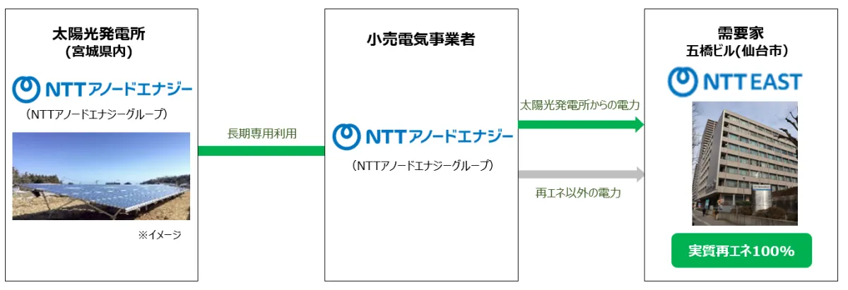 NTT東日本は、「NTT Green Innovation toward 2040」のビジョンのもと、2040年までにカーボンニュートラルを実現するための施策を推進中である。すでに群馬エリアでは水力発電を用いた電力の導入が行われており、今回新たに宮城県内の太陽光発電所から電力を調達し、地域のカーボンニュートラルに貢献する。