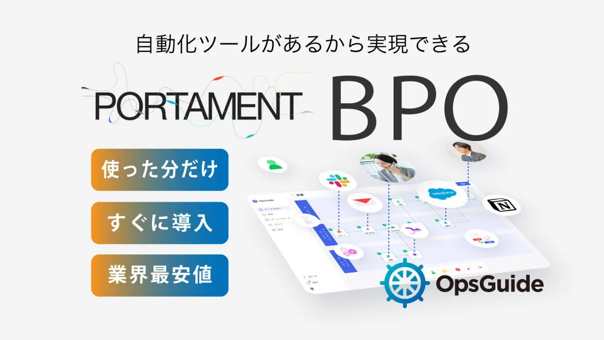 株式会社PORTAMENT(東京都渋谷区、代表取締役:羽田野 朔)は、業界最安値のBPO(ビジネス・プロセス・アウトソーシング)サービスを提供開始しました。自社開発のSaaS型業務フロー自動化ツール「OpsGuide(オプスガイド)」を活用し、特別価格でのトライアルも実施中です。この機会に、業務の効率化を検討してみませんか?