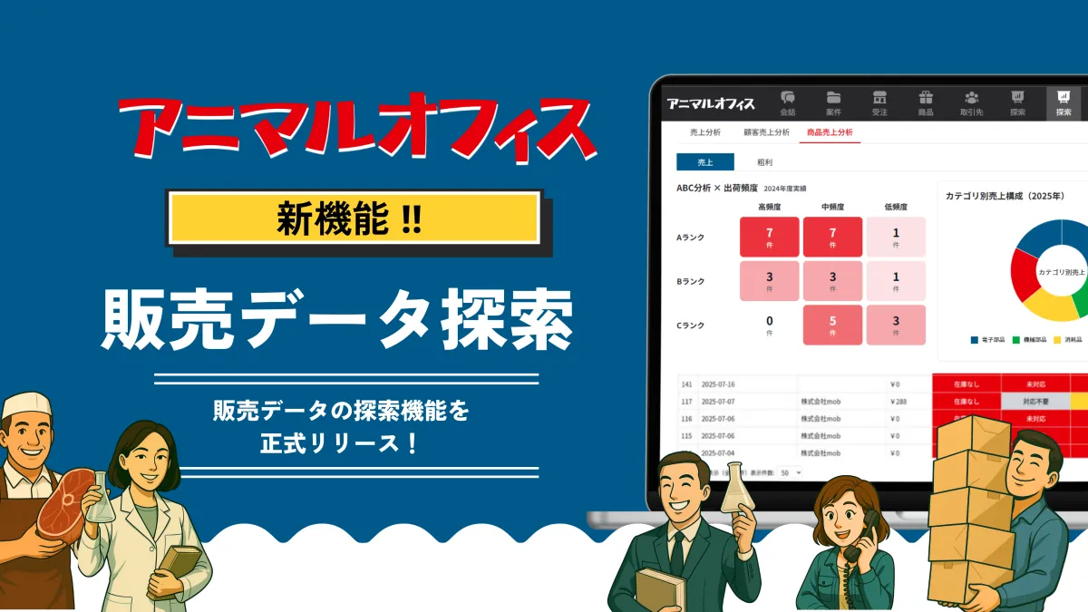 株式会社mob(本社:東京都渋谷区)は、クラウド型販売管理・分析システム「アニマルオフィス」に新たに「探索機能」を追加したことを正式に発表しました。この機能により、販売データの分析がこれまで以上に迅速かつ容易に行えるようになります。