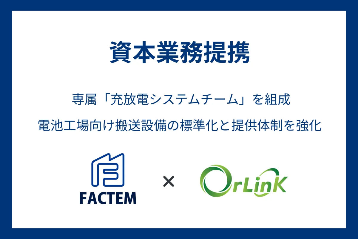 株式会社ファクテム(北九州市)は、ロボット分野における自動搬送制御システムの開発を行うオルリンク(福岡市)と資本業務提携を結びました。この業務提携により、両社はそれぞれの技術を統合し、電池製造の現場に向けた最先端の自動搬送制御システムの「標準化」と「製品・システムの一体提供」を実現することを目指します。