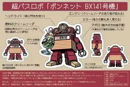 「超バスロボ ボンネットBX141号機」は、観光用スーパーロボットとしてその存在感を誇示します。その異名は「逆襲のアポロ」。全高8.31メートル、重量4.98トンのボディに加え、なんと燃料はクリームソーダというユニークな設定が特徴です。