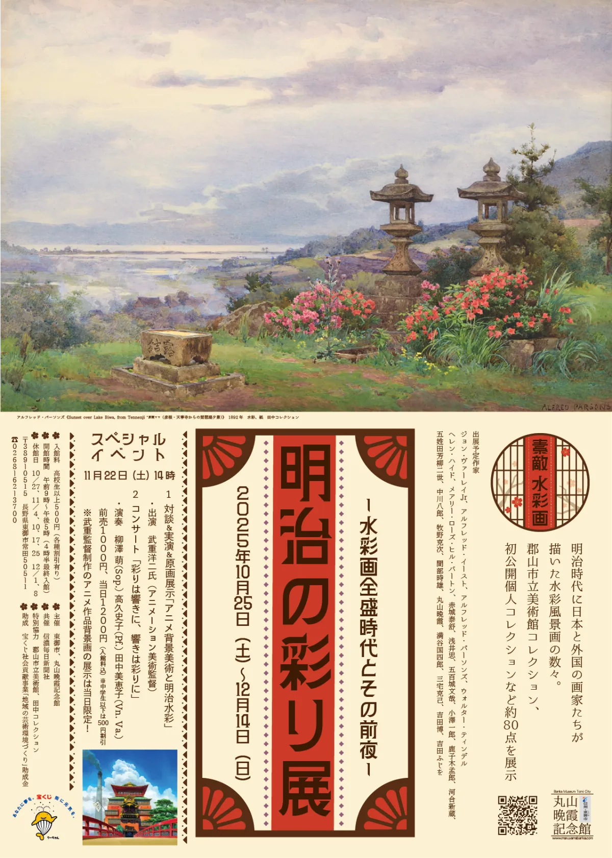 2025年10月25日(土)から、長野県東御市の丸山晩霞記念館で「明治の彩り展 ―水彩画全盛時代とその前夜―」が行われます。この展示会では、明治時代に西洋から導入された水彩画の技法が、日本人の自然への賛美をどのように表現したのかに焦点を当てます。