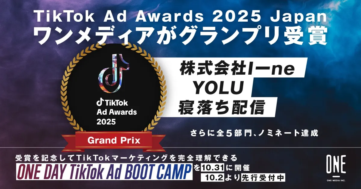 東京都渋谷区に本社を置くワンメディア株式会社が、TikTok for Businessが主催する「TikTok Ad Awards 2025 Japan」においてグランプリを受賞しました。賞の受賞作は、株式会社I-neのプロモーション『寝落ち配信』です。この企画は、TikTokにおける新たなマーケティング手法を示し、全5部門で6作品がノミネートされる成果も収めました。