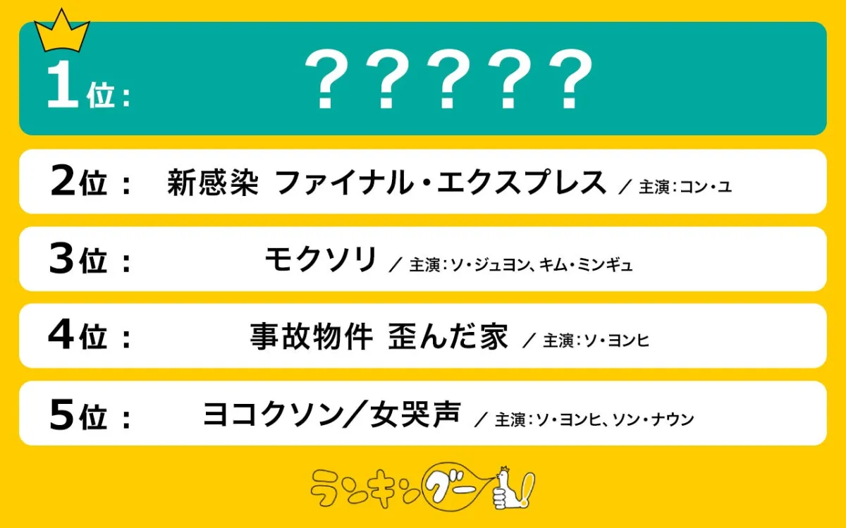 ランキングは、2024年9月28日に実施されたアンケートの結果を基にしています。この調査は搭載すると、視聴者がどんな韓国ホラー映画に魅力を感じているのかが明らかになりました。