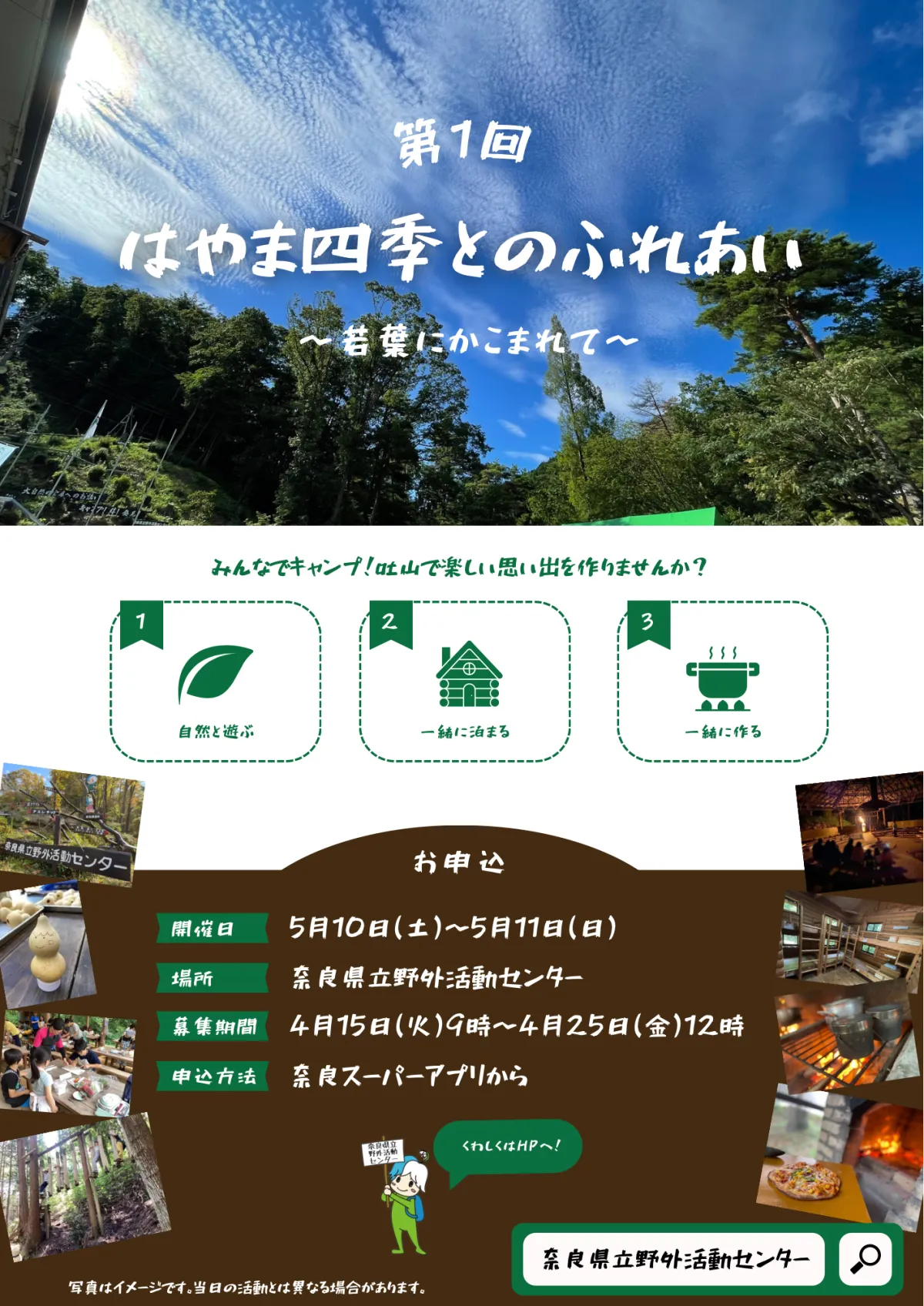 本イベントは、奈良市の「奈良県立野外活動センター」で行われます。自然豊かな場所で、美しい風景を背景にキャンプを楽しむことができます。初日の夜には、みんなで楽しむ「キャンプファイヤー」も計画されています。星空の下での温かいひとときを楽しみながら、参加者同士の交流を深めることができるでしょう。