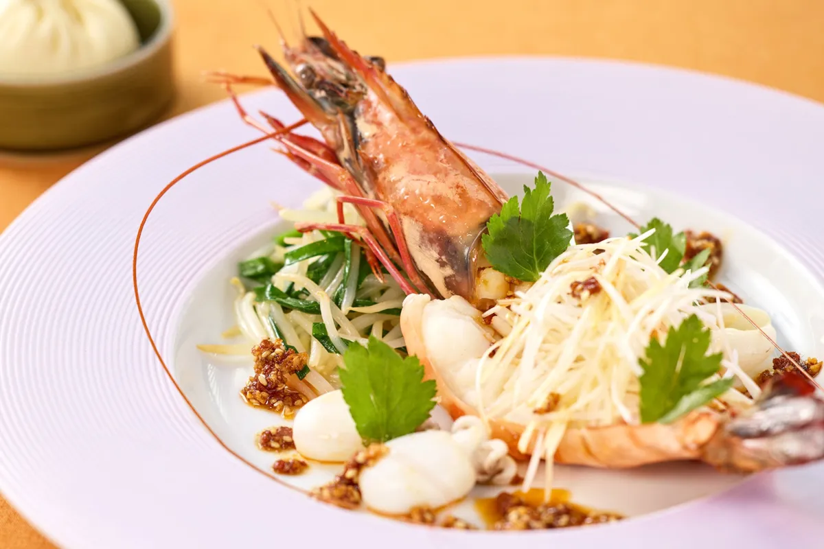 この料理は、1610年まで遡る海老の調理法を用いて、海老と甲イカをふっくらと蒸し上げた一品です。香油と葱の風味が引き立て役となり、海老の甘みを一層際立たせます。
