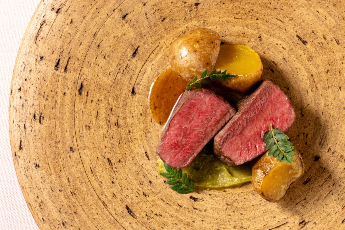 鹿肉のグリル」です。春の鹿は新芽や山菜をたっぷり摂取しているため、肉質は脂肪が少なくあっさりしています。シェフはこの鹿肉をハーブオイルでコンフィし、仕上げに目の前でグリルして香ばしさを引き出します。サイドには、独自の鹿の出汁を凝縮した「鹿のジュ」と、フォアグラのリッチな風味を備えた「フォアグラ木の芽味噌」の2種のソースが添えられ、味変を楽しむことができます。