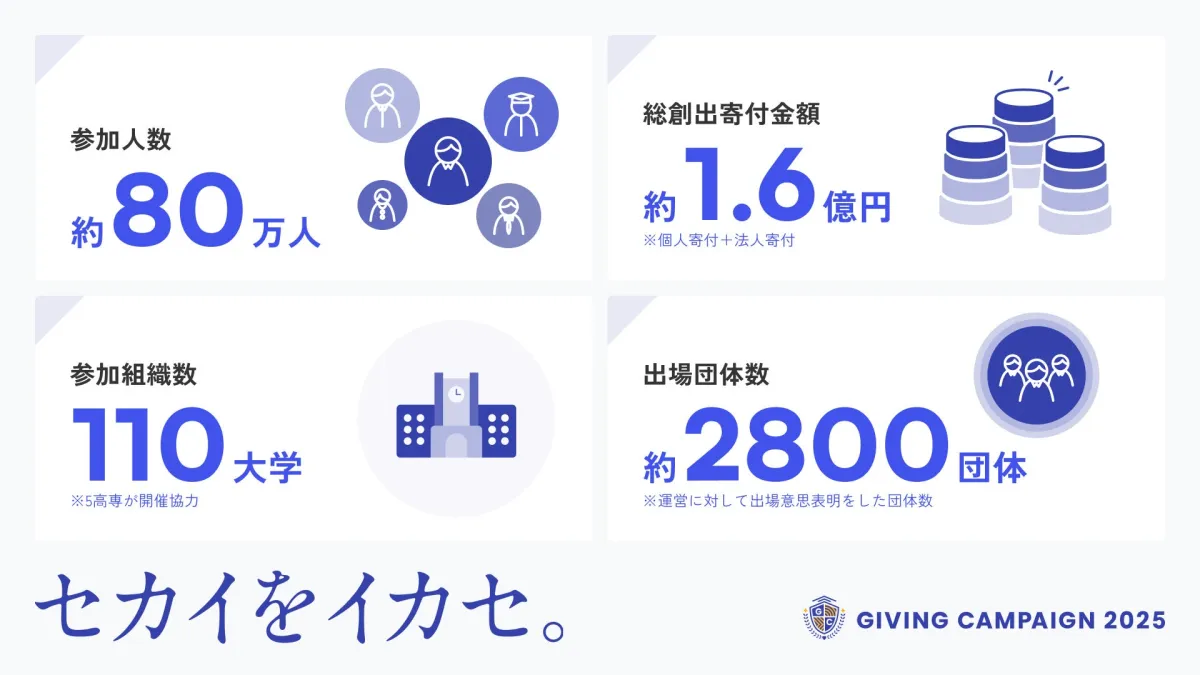 今回の「Giving Campaign 2025」は、これまでの開催の中で最も多くの参加者を集めました。10日間で約80万人がこのプロジェクトに関わり、個人及び法人からの寄付金額は合計で1.6億円に達しました。この数字は、昨年度の参加者数47万人を大きく超えるものです。
