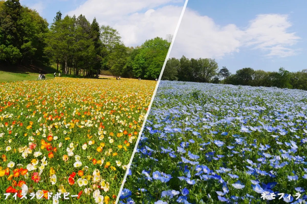 国営武蔵丘陵森林公園では、春の訪れを告げるアイスランドポピーとネモフィラが見頃を迎えています。今年も約70万本のアイスランドポピーと53万本のネモフィラが、春の陽射しの中で美しく咲き誇っています。