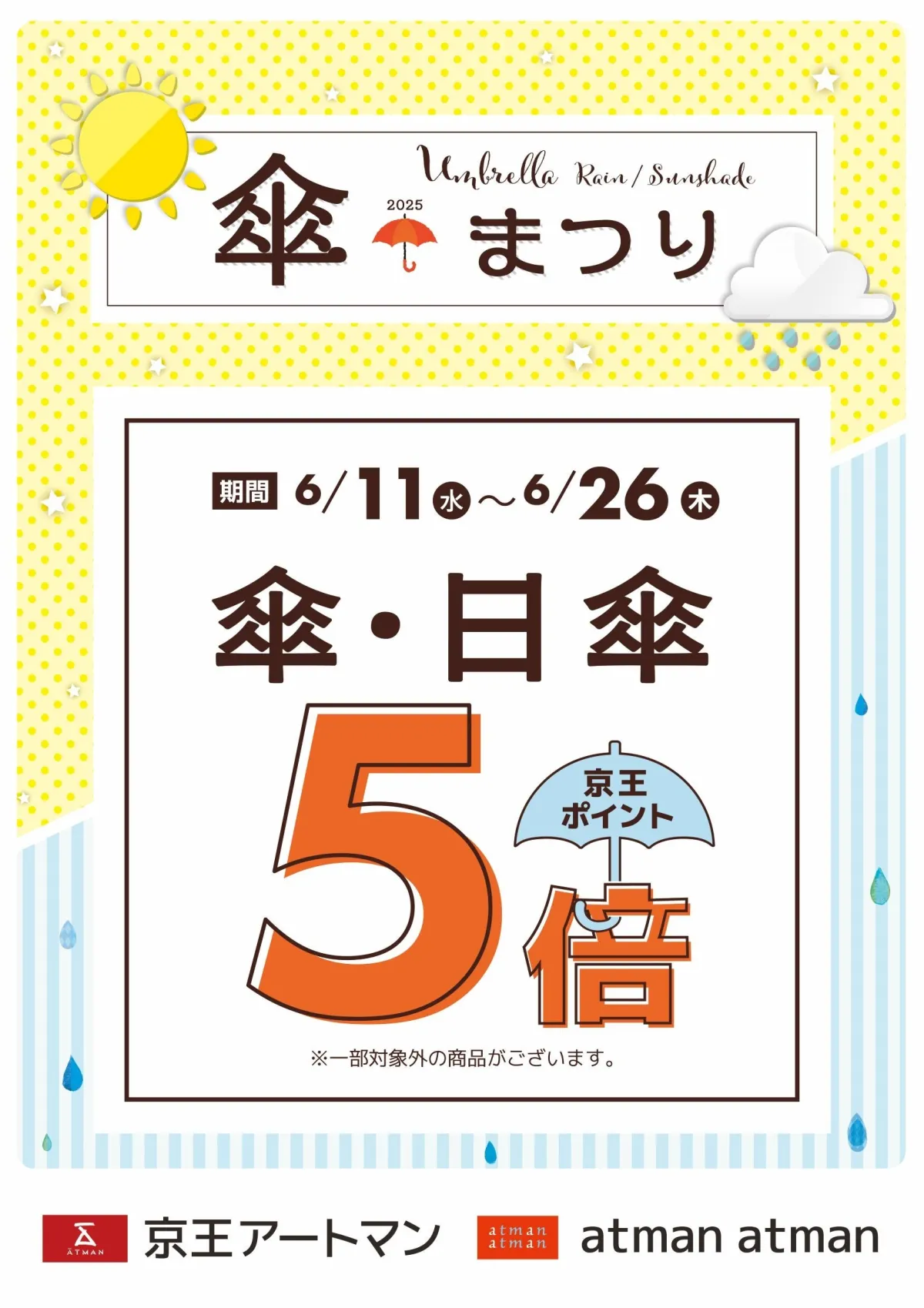 このキャンペーンでは、対象の傘や日傘を購入すると、通常の5倍の京王ポイントが付与されるという嬉しい特典が用意されています。普段から京王アートマンを利用している方はもちろん、これからお買い物を考えている方も、この機会にお得にポイントを貯めてみるのも良いでしょう。