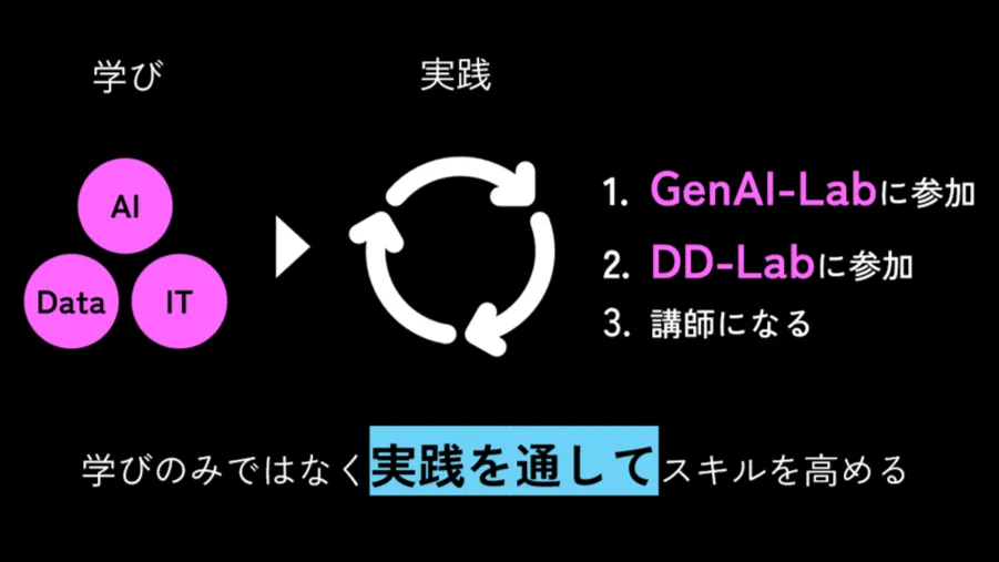 season3では、特に注目すべき2つのプログラムが新たに開始されます。「GenAI-Lab」というプログラムは、以前の「GPT-Lab」を進化させたもので、経営や事業の実際の課題に取り組むことを焦点としています。一方、「DD-Lab」は、データアナリティクスやデータサイエンスに基づく実践的なスキルを育成する新しいプログラムです。