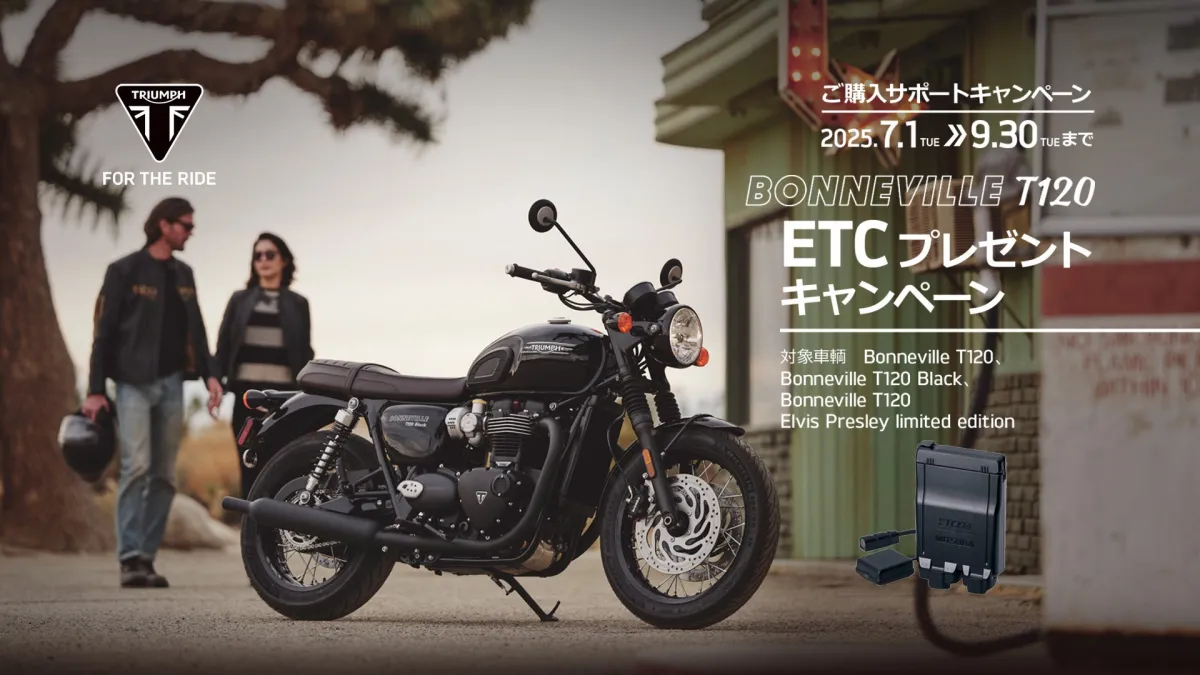 内容: 人気のBONNEVILLE T120を新車でご成約いただいた方に、オプションのETC(電子料金収受システム)をプレゼントします。対象となるETC車載機は、ミツバ製のETC 2.0(品番:AJP-ETC700S)です。ただし、取り付け工賃、部品代は自己負担となりますのでご注意ください。