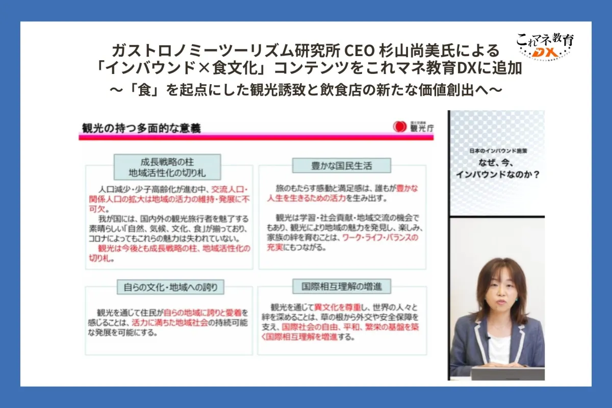 こうした背景を受けて、これマネ教育DXはガストロノミーツーリズム研究所のCEOである杉山尚美氏による新コンテンツを追加しました。このプログラムでは、飲食店が観光資源としての価値を最大限に引き出せる実践的な知識を学ぶことができます。