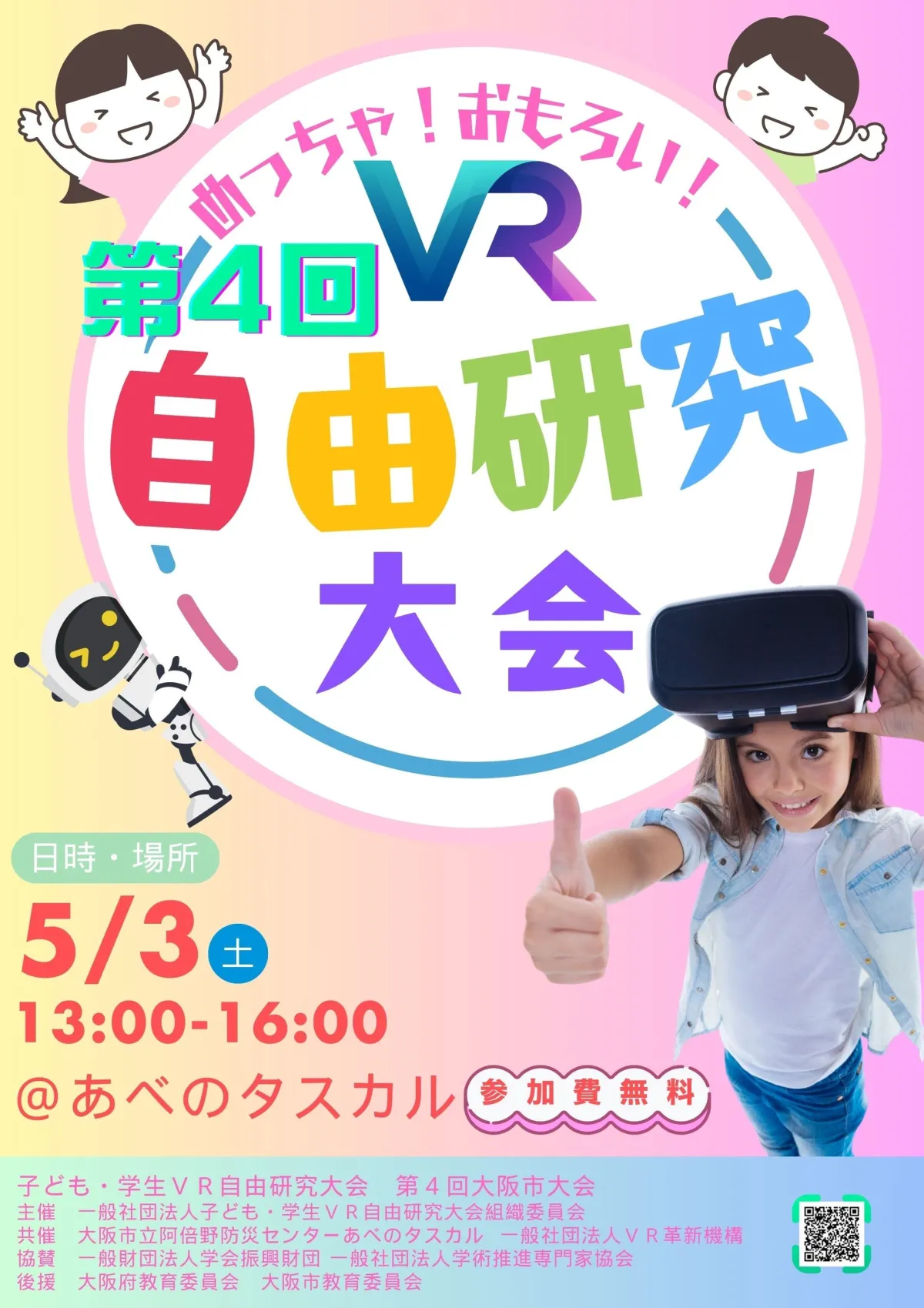 2025年5月3日、未来の科学者を目指す小学生から大学生を対象にした「子ども・学生VR自由研究大会 第4回大阪市大会」が大阪市立阿倍野防災センター「あべのタスカル」にて開催されます。この大会では「ええやん!ぼくらのアイデアでつくる未来」をテーマに、参加者が「防災」をテーマにした自由研究を行い、最新のVR機器や生成AIを用いて未来の社会に貢献するアイデアを探求します。