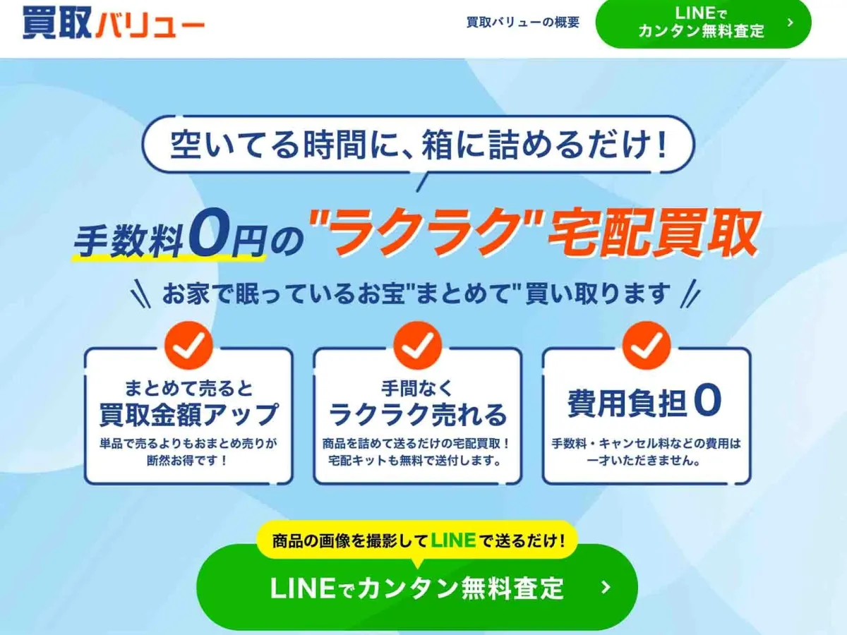 買取バリューは、『手数料0円のラクラク宅配買取』というコンセプトのもと、手軽かつスピーディな買取サービスを提供しています。特にLINEを利用した査定が特徴で、簡単に即日で査定結果を受け取ることができ、利用者はあらかじめ提示された金額をもとに、売却するかどうかを判断します。