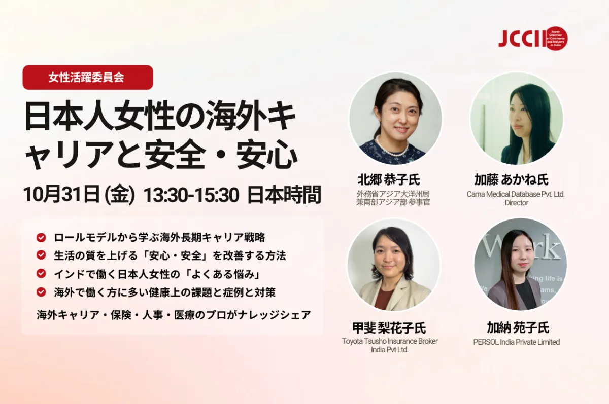 2025年10月31日、インド日本商工会(JCCII)女性活躍委員会が主催する「日本人女性の海外キャリア構築とインドで働く女性たちの安心と安全」をテーマにしたオンラインウェビナーが開催されます。