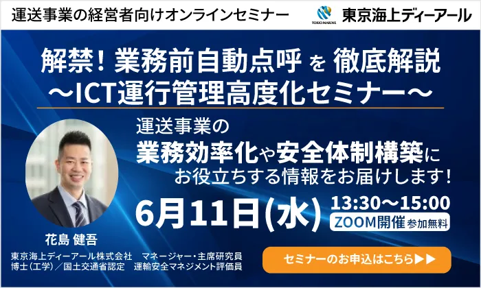 本セミナー「解禁!業務前自動点呼を徹底解説 ~ICT運行管理高度化セミナー~」は、2025年6月11日(水)にオンラインで開催されます。参加費は無料で、事前申込みが必要です。このセミナーでは、業務前自動点呼のメリット・デメリット、導入準備について詳しく解説されます。さらに、最新の運行管理についても学ぶことができ、業者間の遠隔点呼などの新しい取組みについても紹介されます。