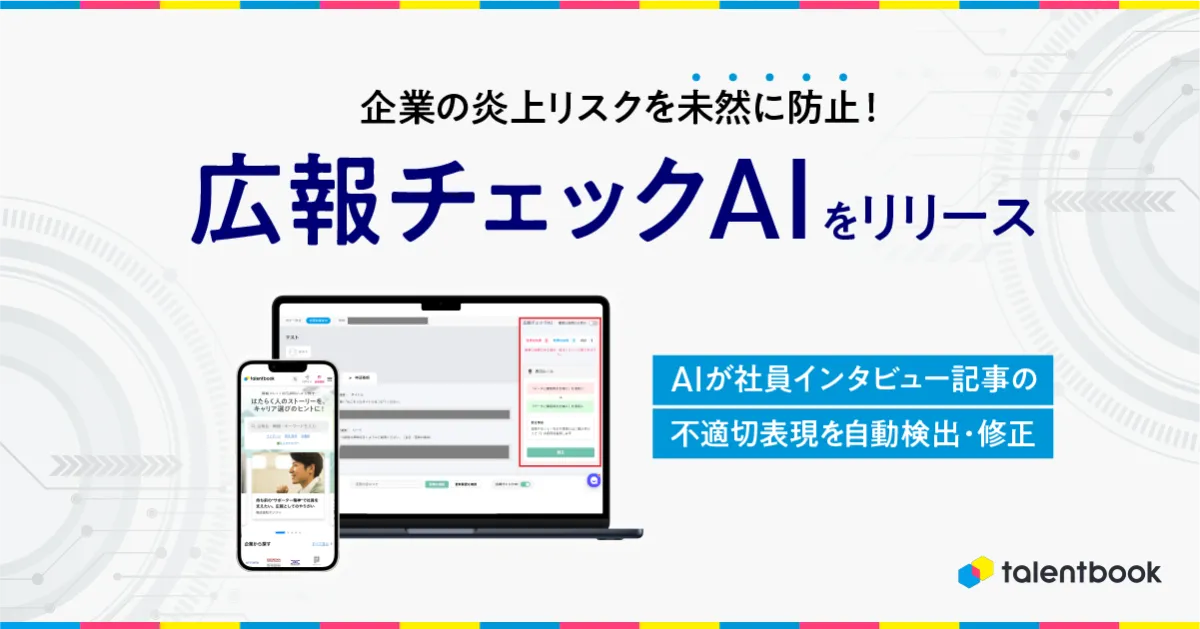 talentbookは2024年12月にリリースした「社員インタビューAI」により、インタビューから記事制作までの工数を従来の1/8に短縮することに成功。その流れを受けて、今度は「広報チェックAI」を開発・導入することで、企業の採用広報活動の効率と安全性を大幅に向上させることを目指しています。