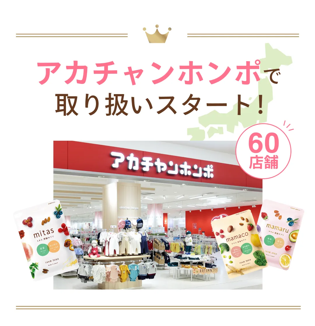 これらのサプリメントは、アカチャンホンポの60店舗で取り扱われており、一部店舗では取り扱いがない場合もありますので、事前に確認してからご購入ください。
