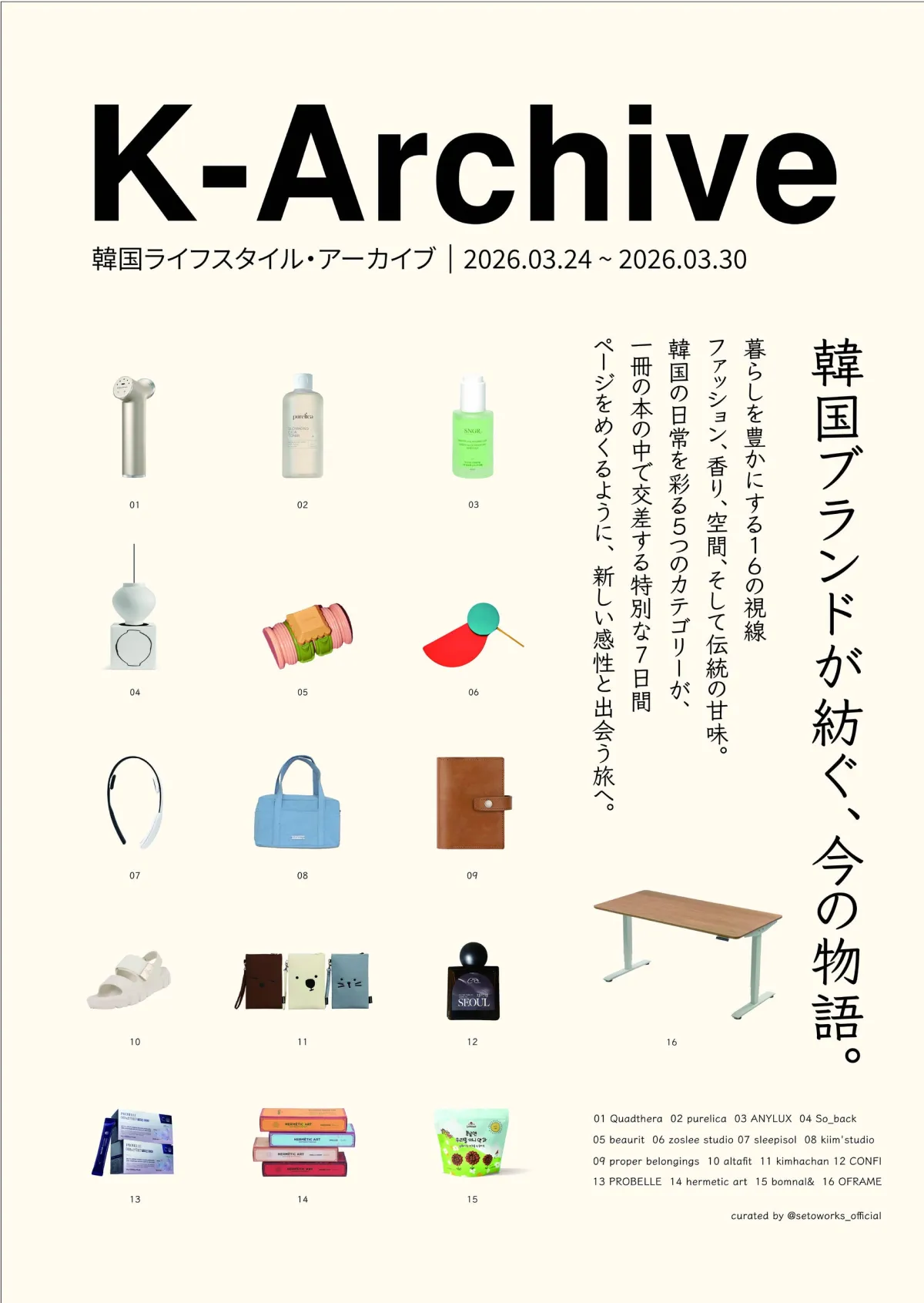 2026年3月24日から3月30日まで、二子玉川 蔦屋家電にて新たなイベント「K-Archive」が行われます。このポップアップストアは、韓国のプレミアムライフスタイルブランドを集め、一冊のエッセイの章に触れるかのような体験を提供します。訪れる人々は、日々の暮らしをより豊かにするアイデアや商品に出会うことができます。