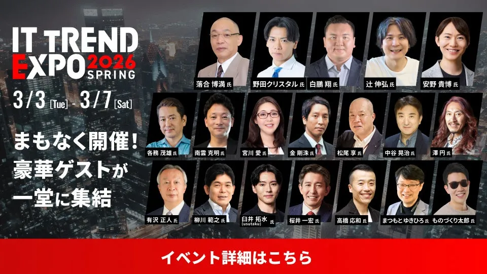 業界最大級のオンライン展示会「ITトレンドEXPO2026 Spring」が、2026年3月3日から7日までの5日間、無料で開催されます。このイベントは、株式会社イノベーションのグループ企業である株式会社Innovation & Co.が主催し、すでに21万人以上の登録者を誇る人気イベントです。