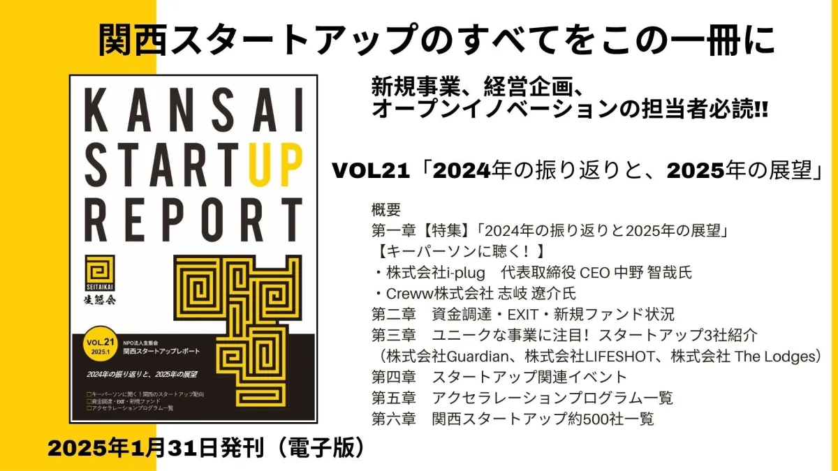 このたび、NPO法人生態会が発行する「関西スタートアップレポート」第21号が、2025年1月末に発売されることが決まりました。これは関西地域のスタートアップに特化し、2024年の動向を詳しく分析した内容となっています。このレポートは、スタートアップ支援の現場で活躍する方々にとって必見の資料です。