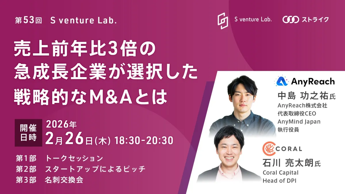 2026年2月26日、東京都港区で株式会社ストライクの主催によるオープンイノベーションイベント「S venture Lab.」が開催されます。今回は、急成長企業AnyReach株式会社の代表取締役、中島功之祐氏が登壇します。