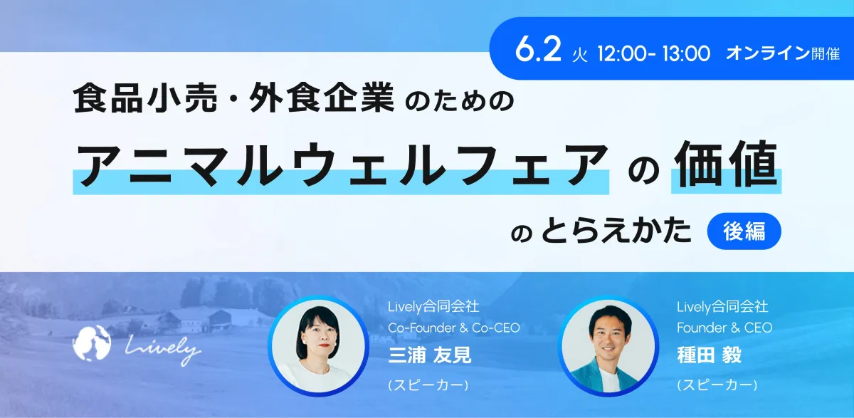 2026年6月2日、Lively合同会社主催のウェビナー「食品小売・外食企業のためのアニマルウェルフェアの価値のとらえかた・後編」が開催されます。アニマルウェルフェアに関心のある企業の方々にとって、貴重な情報が得られる機会となります。