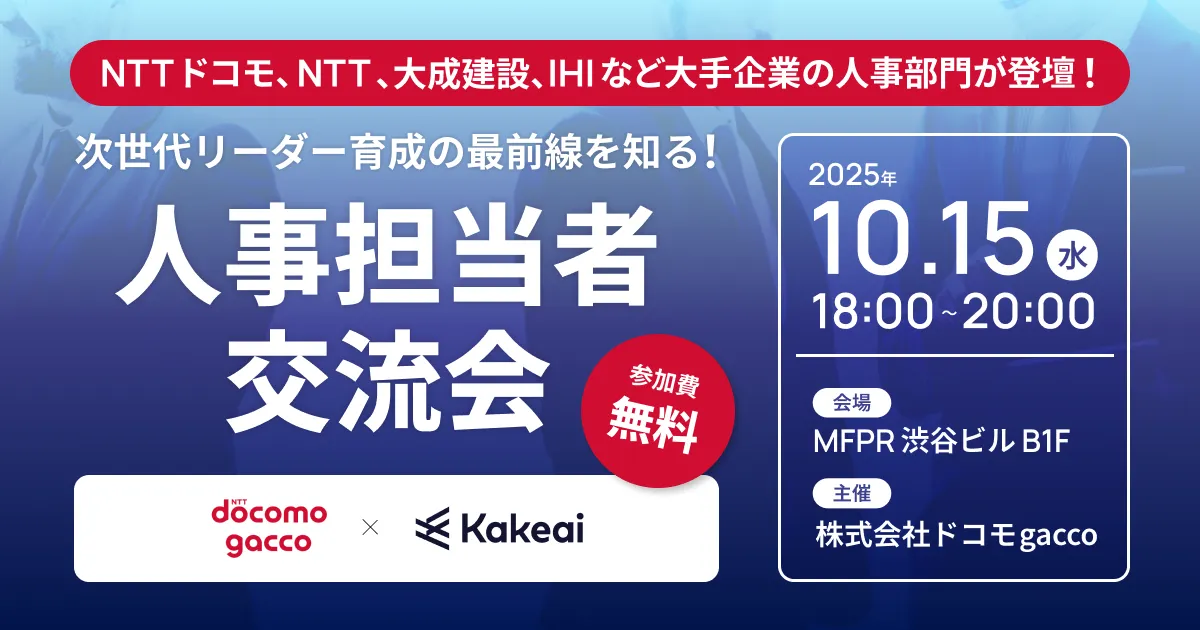 2025年10月15日(水)、東京都渋谷区のMFPR渋谷ビルにて、株式会社ドコモgaccoが主催する「次世代リーダー育成の最前線を知る!人事担当者100人交流会」が開催されます。本イベントでは、NTTドコモをはじめ、大成建設やIHIといった名だたる企業から人事部門の担当者が登壇し、次世代リーダー育成に関する最新の取り組みや成功事例をピッチ形式で発表します。