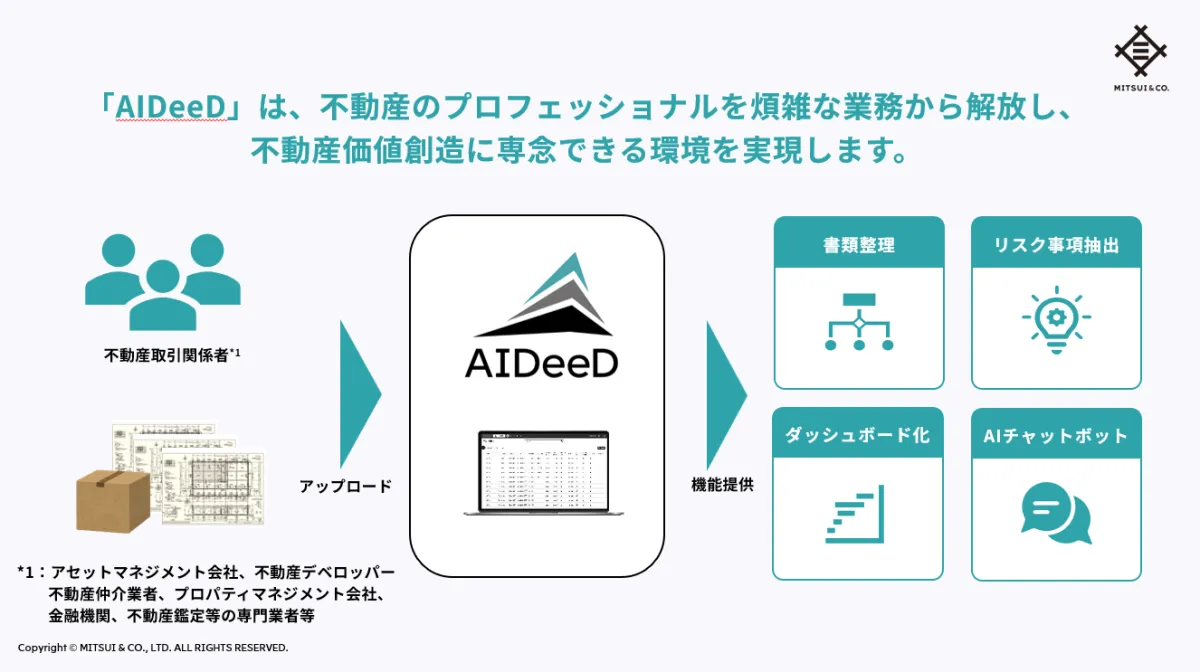 三井物産株式会社は、生成AIを活用した不動産業務の効率化プラットフォーム「AIDeeD」を開発し、2024年から実証実験を開始することを発表しました。このプラットフォームは、不動産取引や運用業務の自動化・高度化を目指すもので、業界全体の効率化を実現することが期待されています。