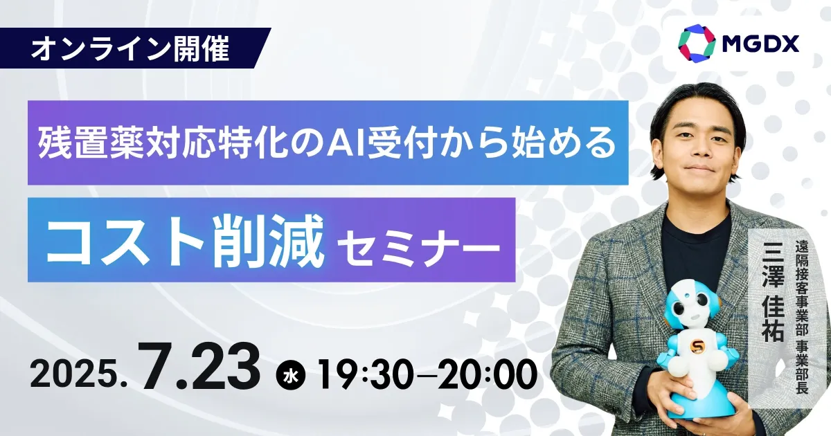 2025年7月23日(水)、医療AI企業の株式会社MG-DXが主催するオンラインセミナー「残置薬対応特化のAI受付から始めるコスト削減セミナー」が開催されます。薬局業界における人手不足という課題を背景に、AI技術を活用した新しい接客スタイルを提案するこのイベントは、特にドラッグストアや調剤薬局に従事する皆さまにとって、導入のためのヒントとなるでしょう。