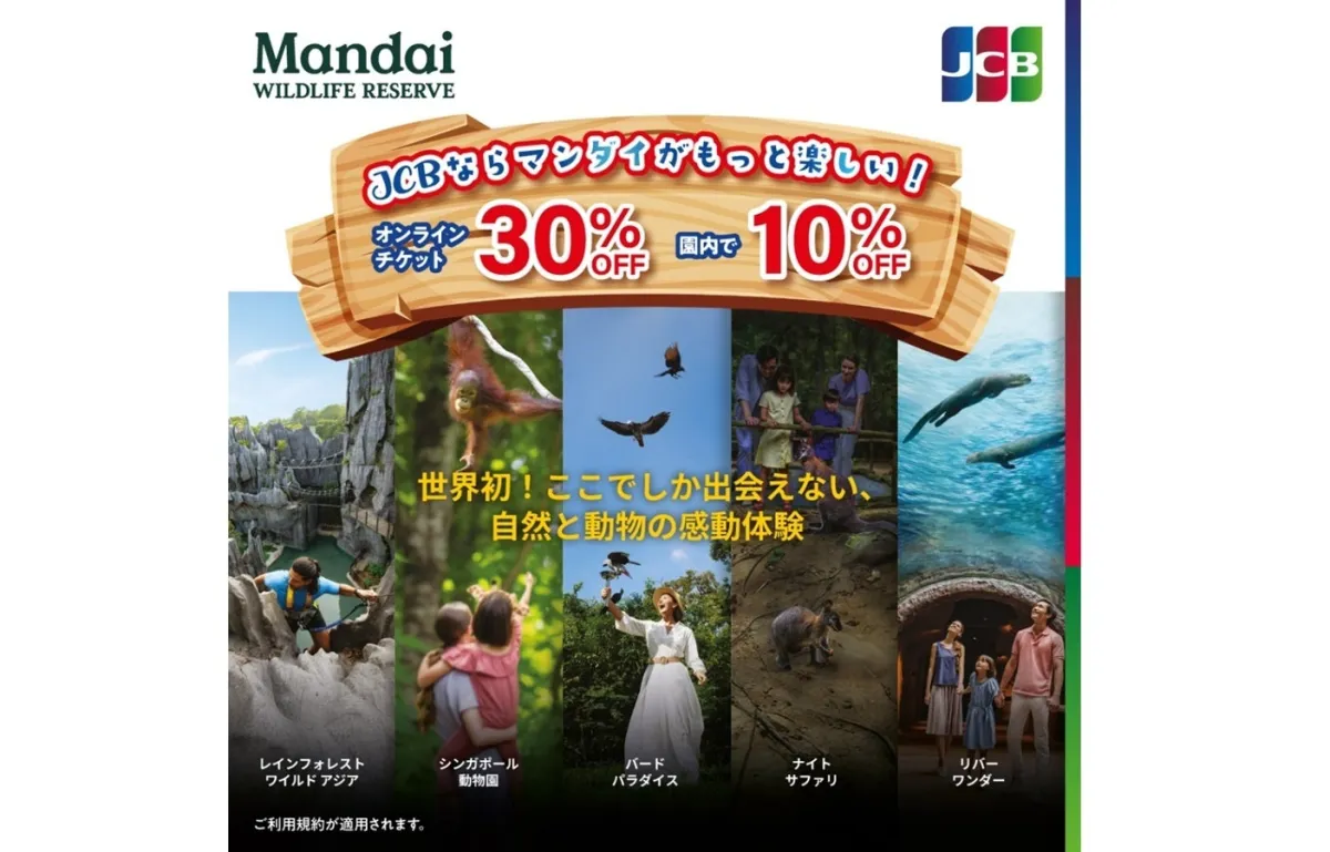 日本発の国際カードブランド、JCBがシンガポール動物園をはじめとする人気観光施設で特別なキャンペーンを実施します。このキャンペーンでは、JCBカードを利用することで、シンガポールにあるマンダイ・ワイルドライフ・リザーブの各パークへの入場チケットが30%オフ、さらにはパーク内のレストランやショップでも10%オフの特典を受けることができます。