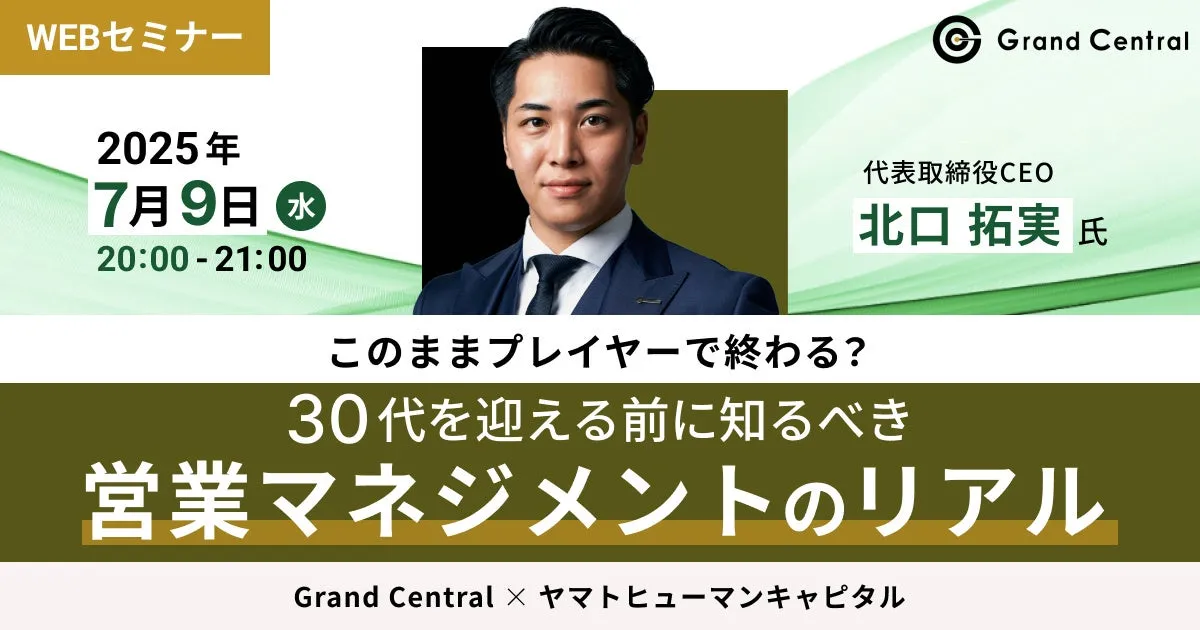 このセミナーでは、株式会社Grand Centralの代表取締役CEOである北口拓実氏が登壇し、営業マネージャーとしての成長に役立つリアルな情報を提供します。特に、営業マネジメントにおけるスキルとキャリアパスに焦点を当て、30代を迎える前に必要な知識を得る絶好の機会です。