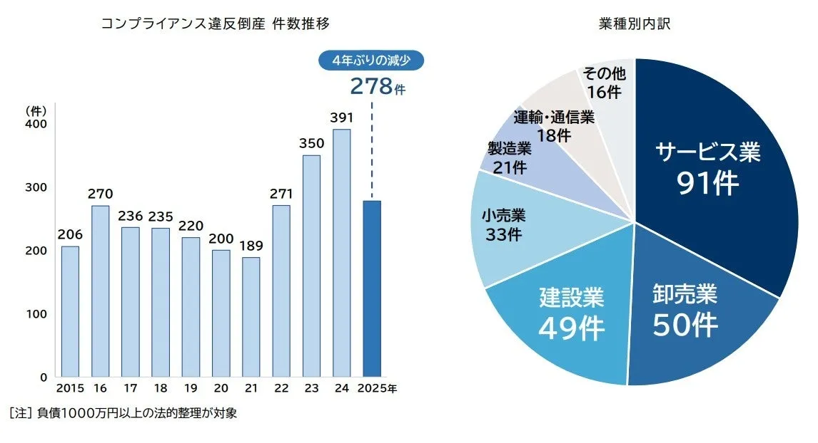 2025年に発生したコンプライアンス違反倒産の件数は278件で、前年の391件から113件、つまり28.9%の減少となりました。この減少は4年ぶりのことであり、企業の財務状態が改善されたことが主な要因と考えられます。ただし、この結果に安堵するべきではない背景も見え隠れしています。