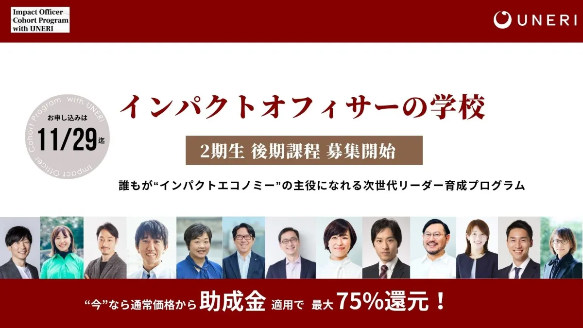 株式会社UNERIが提供する教育プログラム「インパクトオフィサーの学校」の第2期後期プログラムの受講生募集が開始されました。このプログラムは、次世代のリーダーを育成し、非財務的価値を経営と事業に活かすことを目指しています。