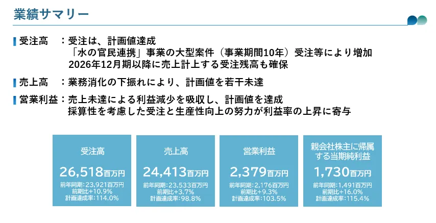 昨今の事業環境を考慮した上での決算発表となり、日水コンの業績は注目されました。2025年12月期の連結決算は、前年よりも成長を示す結果となっており、特に公共インフラ事業が堅調に推移しました。
