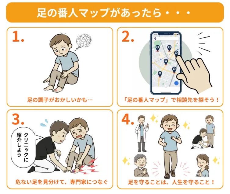 『足の番人マップ』プロジェクトは、足の健康を守るという視点から、より良い社会を作るための重要な一歩を踏み出しました。足のトラブルは見えないところで進行していることが多いですが、早期発見こそがその解決策です。これからの日本において、私たち一人ひとりの意識が、歩行基盤の安全を確保する大きな力となるでしょう。